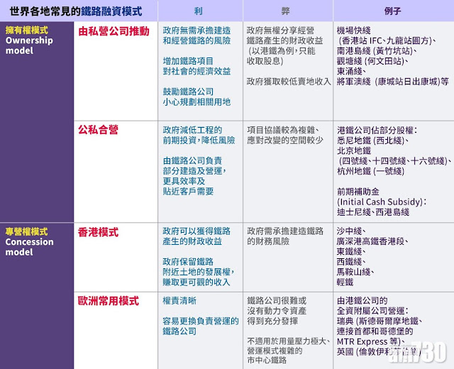 鐵路基建項目涉及巨額成本,前期投資昂貴,之後的營運、維修及資產更新又是持續的巨額支出,所以各地政府採用不同方法提高財務可行性,大致分為「擁有權模式」(ownership model) 和「專營權模式」(concession model)。